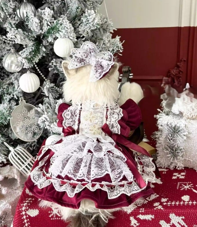 深みのあるボルドーカラーに、繊細なホワイトレースを重ねた、クラシカルで格調高いドレス。